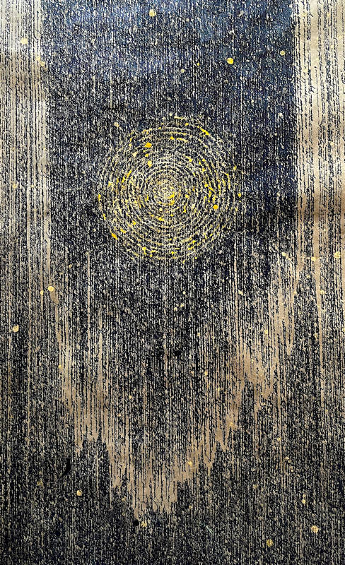 In archetipi della simbolica geometrica, cerchi concentrici inabissano il segno in cromatismi centripeti e spirali centrifughe, le quali si aprono nello spazio come a cercare, o forse ad avvenire, in altre traiettorie del possibile, verso una sospensione del tempo, in una evocazione cosmica del gesto di-segnante.