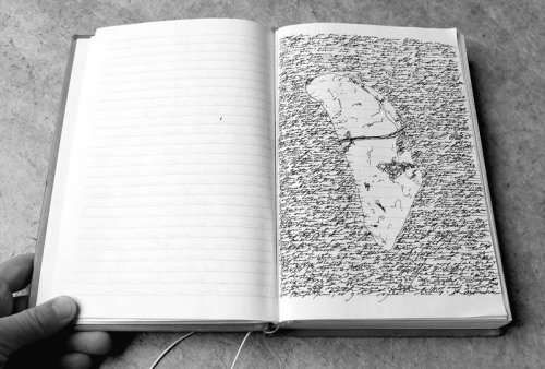 Ed è nelle pagine del libro che il ‘racconto’ segnico si fa nella sua piena evidenza visuale. L’artista scrive una storia ‘senza senso’, senza inizio e senza fine, con nuclei pre-alfabetici che sembrano spoglie di cosmogonie o cartografie di un naufragio del linguaggio. Sono ‘report’ di un sospeso addio al Senso : apocalissi della scrittura che riflette la sua caduta ? La domanda resta aperta, quanto inattualmente contemporanea, sulla soglia tragica del tempo dell’arte come tempo del dis-senso.