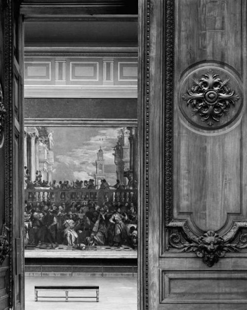 Ici une statue de dos qui semble regarder la fin d’un monde. Là une vue partielle des Noces de Cana de Véronèse qui de plus indique par le banc vide la place de l’absent. Car absents nous sommes et présents voyeurs, mais extérieurs à l’image nous agissons en regardant presque comme si c’était par le trou de la serrure.