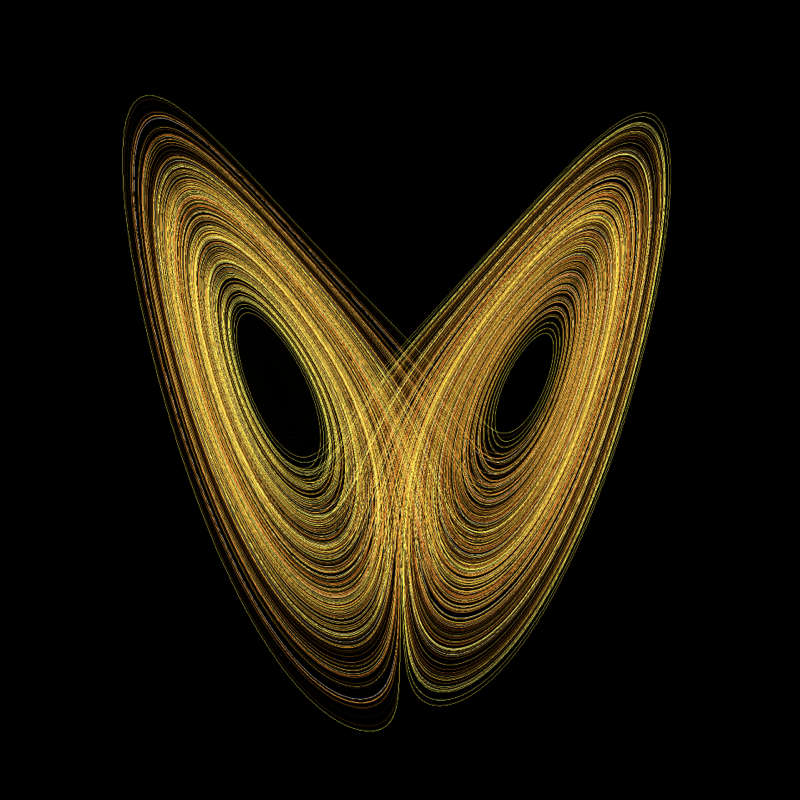 Au-delà du temps caractéristique, on ne peut plus rien calculer car les écarts s’amplifient de façon exponentielle, jusqu’à un certain point quand même car ça va vite et on sortirait aisément des limites de l’Univers, comme le fait remarquer le mathématicien ami du Maître en modernité. À chaque simulation, le phénomène se traduit par une trajectoire dans l’espace et comme il y a toujours un écart, même infime, dans les conditions initiales, les trajectoires diffèrent plus ou moins avec cette amplification plus que rapide. Au-delà du temps caractéristique, le système, ou plutôt le produit de la simulation, enfin la trajectoire, va retomber dans certains parages, que l’on appelle « attracteurs étranges », et y rester, et toutes les trajectoires des phénomènes issus des différentes simulations vont se retrouver par là comme si elles étaient attirées... étrangement. Tout cela nous donne une très jolie image en forme de papillon et de fait l’attracteur étrange devient « l’attracteur du papillon ».