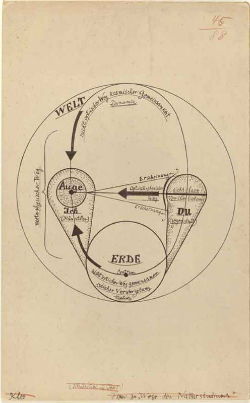 Le dessin de Paul Klee décrit ce que nous appellerons le circuit du sensible, puis, avec Bernard Stiegler, le circuit noétique. Avant d’en arriver là, arrêtons nous un instant sur les théories de l’art moderne du peintre suisse qui fut professeur au Bauhaus à Weimar puis à Dessau. Examinons sa tête à toto. Ce n’est pas le schéma d’une fusion romantique avec la nature mais celui de circuits mettant en évidence la multiplicité des interactions entre les voies optiques et non optiques : la voie non optique d’enracinement terrestre et la voie non optique cosmique interagissant avec la voie physico-optique qui semble transpercer celle des apparences sensibles. Le schéma les relie avec des lignes et flèches de pensée dynamiques qui portent vers un là-bas. La pensée est en effet pour Klee le père de la flèche