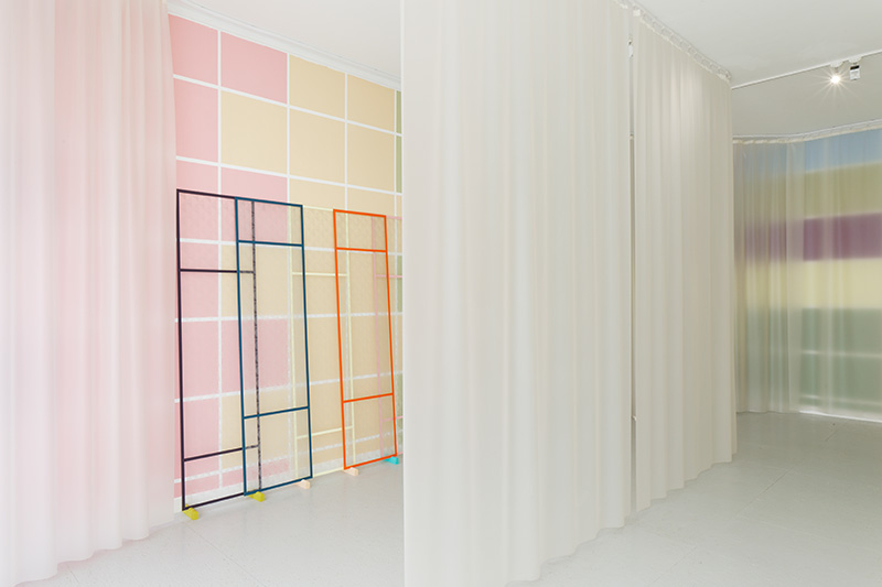 On peut lire, sur le site de bricolage monartisanat.fr : « La bâche et le tissu technique peuvent être indispensables aussi bien pour les particuliers que pour les professionnels. Appréciés pour leur résistance, leur souplesse et leur esthétique, ils sont utilisés en guise de protection, d’aménagement intérieur et extérieur, de couverture de façade, d’isolation phonique ou encore de brise-vue ». Le terme « brise-vue » est excellent. Comme les brise-lames protègent le port de la houle du large, la bâche empêcherait un regard un peu trop direct ou insistant sur les choses. La bâche est donc un rempart où vient s’échouer notre acuité visuelle. Disposée en vagues dans l’espace d’exposition, elle joue le rôle d’un prisme, en ce qu’elle démultiplie la perception des formes colorées. L’incertain fait trembler le précis, soulève le simple et le délicat comme l’aller-retour anadyomène d’une vague, une respiration douce ou le mouvement de diastole et de systole du cœur. Il y a une sensation de corps flottants et une perte de la vision centrale au profit de la vision périphérique : on ne voit que par les côtés. En parlant des œuvres d’Audrey Perzo, j’ai le sentiment d’être une ophtalmologue qui décrit les divers symptômes d’une diminution progressive de la vue.
