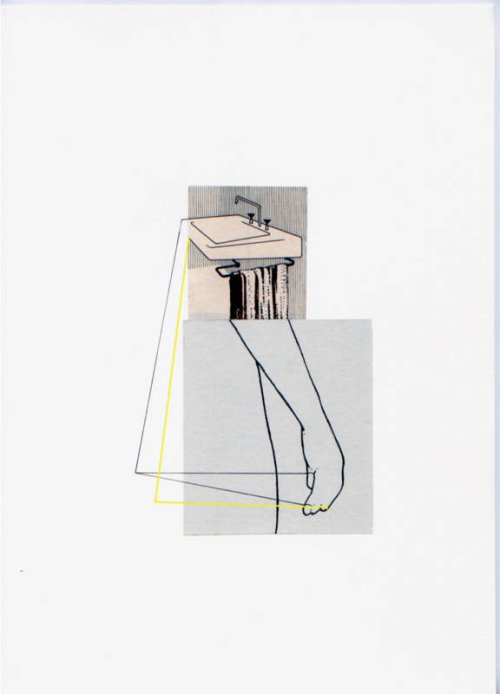 Effectivement, tes montages opèrent des télescopages, d’autant qu’ils sont faits d’images procédant d’univers et de styles différents : catalogue de plomberie vs planche anatomique, dessin technique vs dessin artistique... Au-delà de la surprise, tu joues souvent avec l’humour noir, cher aux surréalistes...
