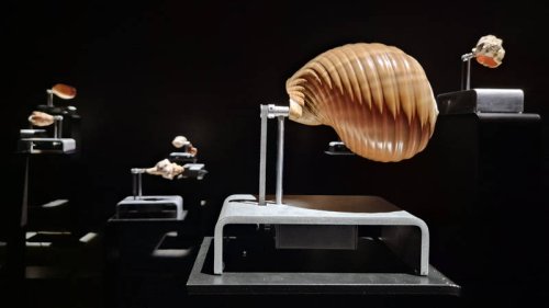 A l’étage, parmi les créations qui font l’unanimité lors du vernissage, il y a l’installation sonore Hard Times – Soft Sounds de Moritz Simon Geist. Un titre qui renvoie à la période de sa conception, le confinement, comme à la délicatesse des sons qu’elle produit. L’idée est simple : motoriser des coquillages contenant de petites quantités d’eau qui sonorisent leurs rotations. Avec une scénographie lumière tout particulièrement soignée pour qui découvre la vingtaine de modules aux comportements instrumentistes. Les sons répétés, dans l’espace comme dans le temps, de circulations liquides augmentées par les coquilles qui sont autant de caisses de résonance, s’accordent parfaitement.