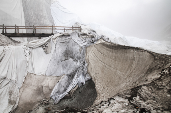 Aporie du réchauffement, ce drapé n’a rien d’antique et ses couvertures agricoles destinées, en des temps « plus cléments », à protéger les cultures du gel, jouent ici, elles aussi, un rôle paradoxal, en s’escrimant à protéger la glace des ardeurs du Dieu du bronzage.