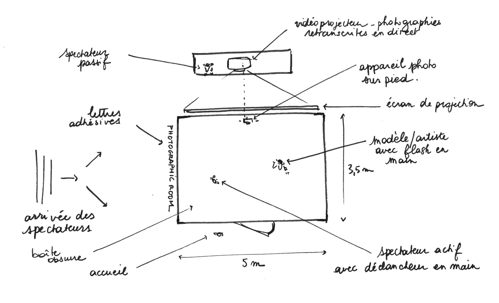 Oui, il faut en venir au fait : à l’intérieur de la boîte, la photographe est aussi le modèle et elle nous attend. Mais elle nous attend, puisque c’est d’une boîte noire qu’il s’agit, en tenue d’Eve, nue, dans le noir absolu. En fait, une fois que nous sommes entrés, elle nous aborde, nous parle, nous savons qu’il y a une ligne invisible à ne pas franchir, celle du contact physique direct. Mais parler est possible. Nous apprenons que le mode opératoire est le suivant : nous lui indiquons la pose que nous désirons qu’elle prenne et nous indiquons aussi l’orientation qu’elle doit donner au flash dont elle est dotée et qui se déclenchera au moment où, à notre demande, elle appuiera sur le déclencheur.