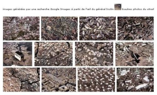 « Au départ c’est une déambulation dans Paris, cimetière Montparnasse. La découverte d’une tombe étrange, celle du général Hinstin (1831-1905), avec vitrail détérioré par le travail du temps, qui défigure le visage inscrit. […] Devant une telle image on ne sait qui regarde, qui est regardé : le miroir (se) dissout. Et c’est cet endroit, cet entre-deux vibratoire en chacun comme en tous, qui signe la marque d’Instin [14]. »