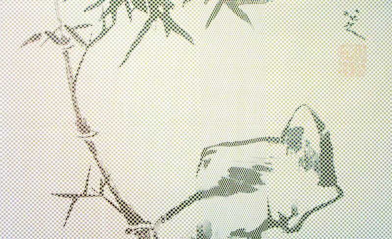 Ce tissage de l’image photographique et du papier kraft, produit l’entrecroisement de la trace du passé et de l’objet du présent. Il entrecroise ainsi l’espace photographique qui est le présent du passé et l’espace du futur dans le présent. Sur l’ensemble de la surface tissée, l’image photographique, comme vestige du passé, se libère de sa fixité et le papier kraft se libère lui de sa matérialité. De même, les formes peintes au pinceau sur le papier kraft s’élèvent sur le fond.