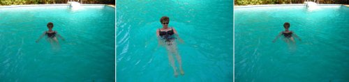 Maintenant un autre visuel de Bou-Saada, un document personnel : Martine T. au bord de la piscine de l’hôtel Kerdada (anciennement Transatlantique, construit en 1913 et rénové en 1970 par Fernand Pouillon). On peut la voir détendue, car, grâce à son intervention énergique, elle a convaincu le jardinier de l’hôtel de remplir l’élégante piscine dallée de mosaïques bleues d’une belle eau turquoise dans laquelle il est délicieux de se tremper.