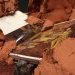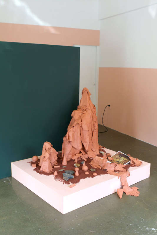 Derrière chaque dessin, peinte sur le mur donc, une forme géométrique simple. Parfois, venant interrompre ou s’incruster dans l’image de la vidéo l’une ou l’autre de ces mêmes formes dans la même couleur verte, et dans l’installation-sculpture, cônes, boules, cylindres ou cubes se tiennent là à la fois dans une sorte d’indifférence posée à la masse chaotique de terre qui semble être une montagne ou une coulée de boue figée, mais se voient pour certains emportés et renversés.