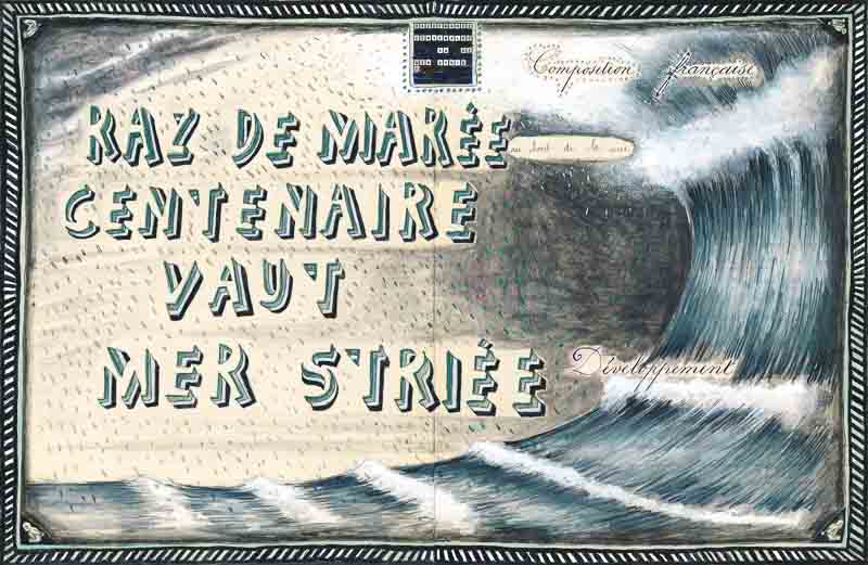 La pratique d’Alexandre Leger est également nourrie de poésie, celle d’Apollinaire, de Pasolini et de Perec, pour ne citer que quelques auteurs, et l’artiste exprime une admiration profonde pour l’œuvre de William Blake. Lors de ma visite à son atelier, il a évoqué un dessin de Victor Hugo, celui qui représente une immense vague. Dessinée au lavis à l’encre brune, la vague porte un navire, partiellement masqué par des éclats d’écume peints à la gouache, qui bascule sur sa crête. En bas du dessin sont écrits les mots MA DESTINÉE. Fasciné et effrayé par ce dessin, Alexandre Leger rend hommage à Hugo en dessinant la vague à son tour. Dans son Dessin-Poème, la vague ne porte pas de navire mais les mots « Composition française ». Elle semble prête à engloutir dans son sillage le poème qui se trouve à sa gauche, dessiné en grands lettres bâtons comme une prémonition étrange : RAZ DE MARÉE CENTENAIRE VAUT MER STRIÉE. L’artiste s’inspire du romantisme de Hugo pour mener une réflexion autant sur sa pratique que sur les incertitudes de la vie, offrant au spectateur un commentaire sur les aléas du processus même de la création plastique et poétique.