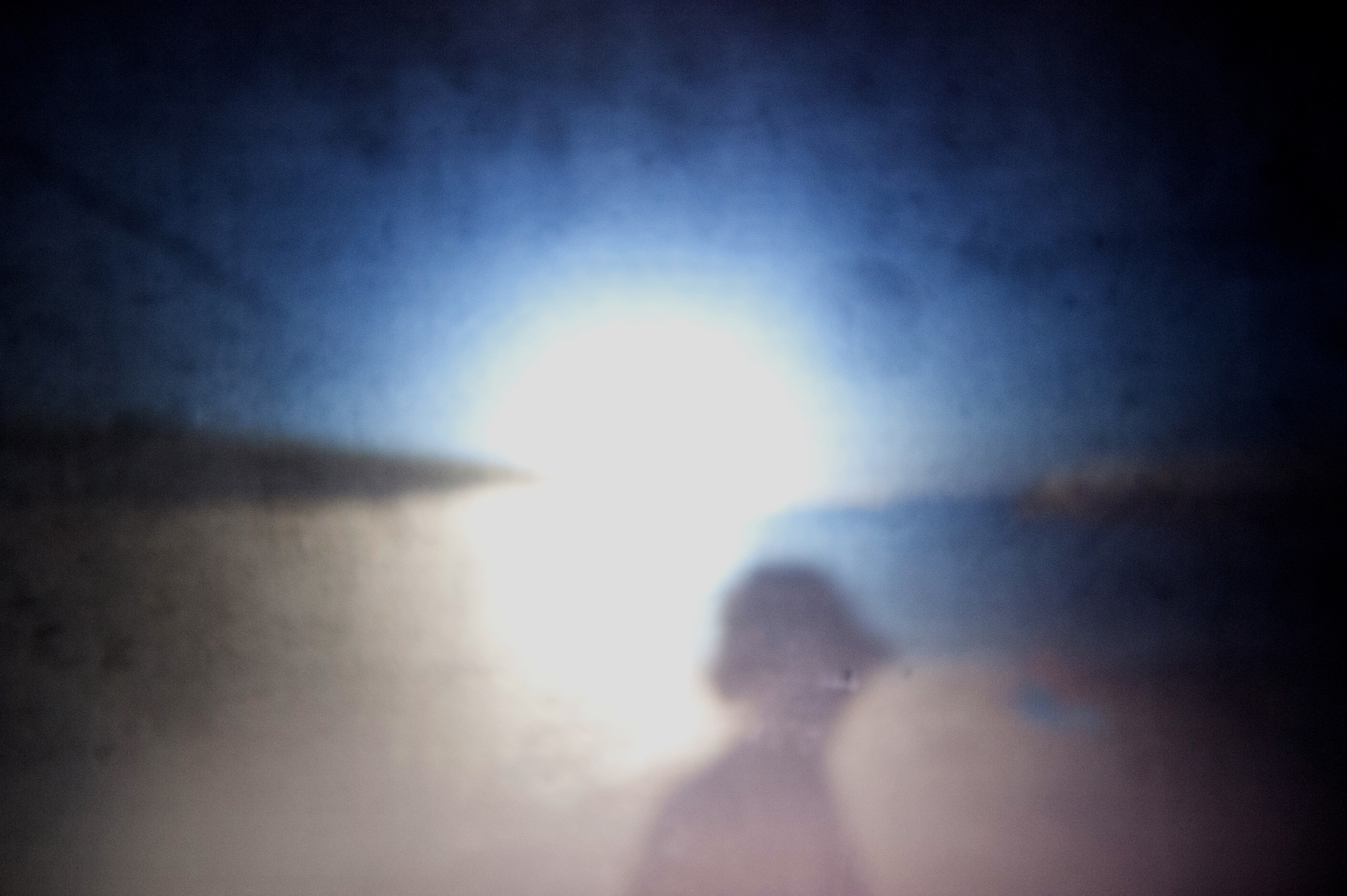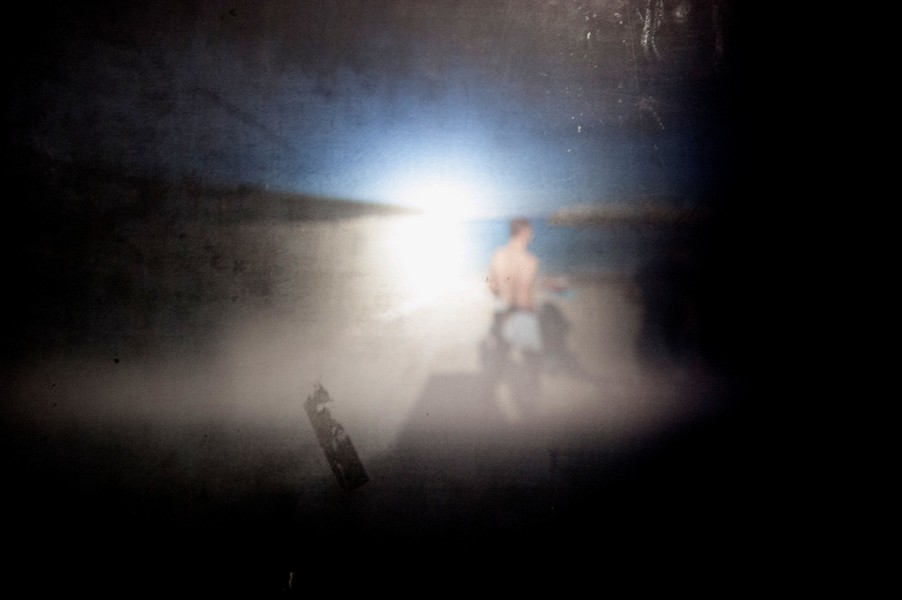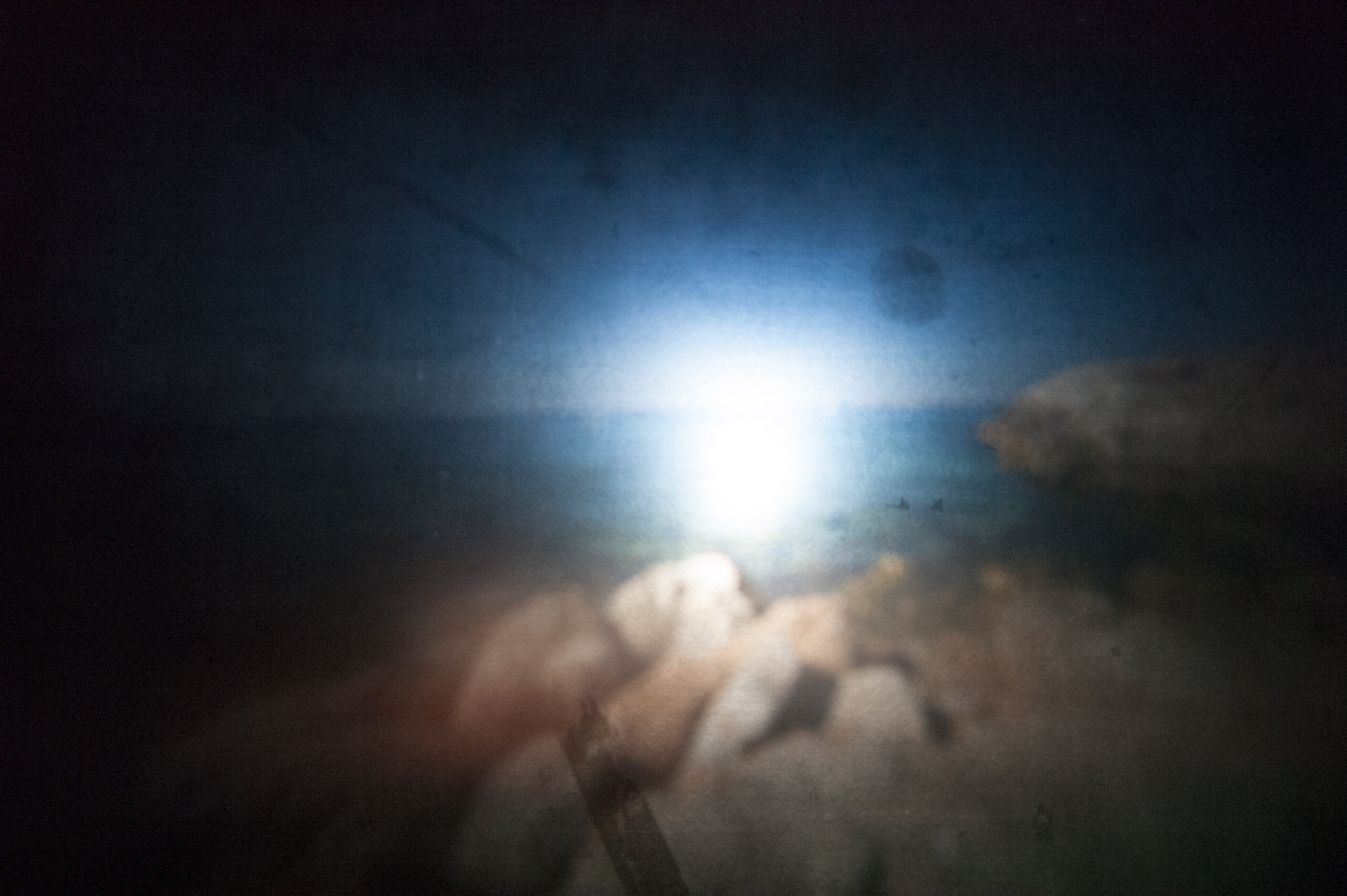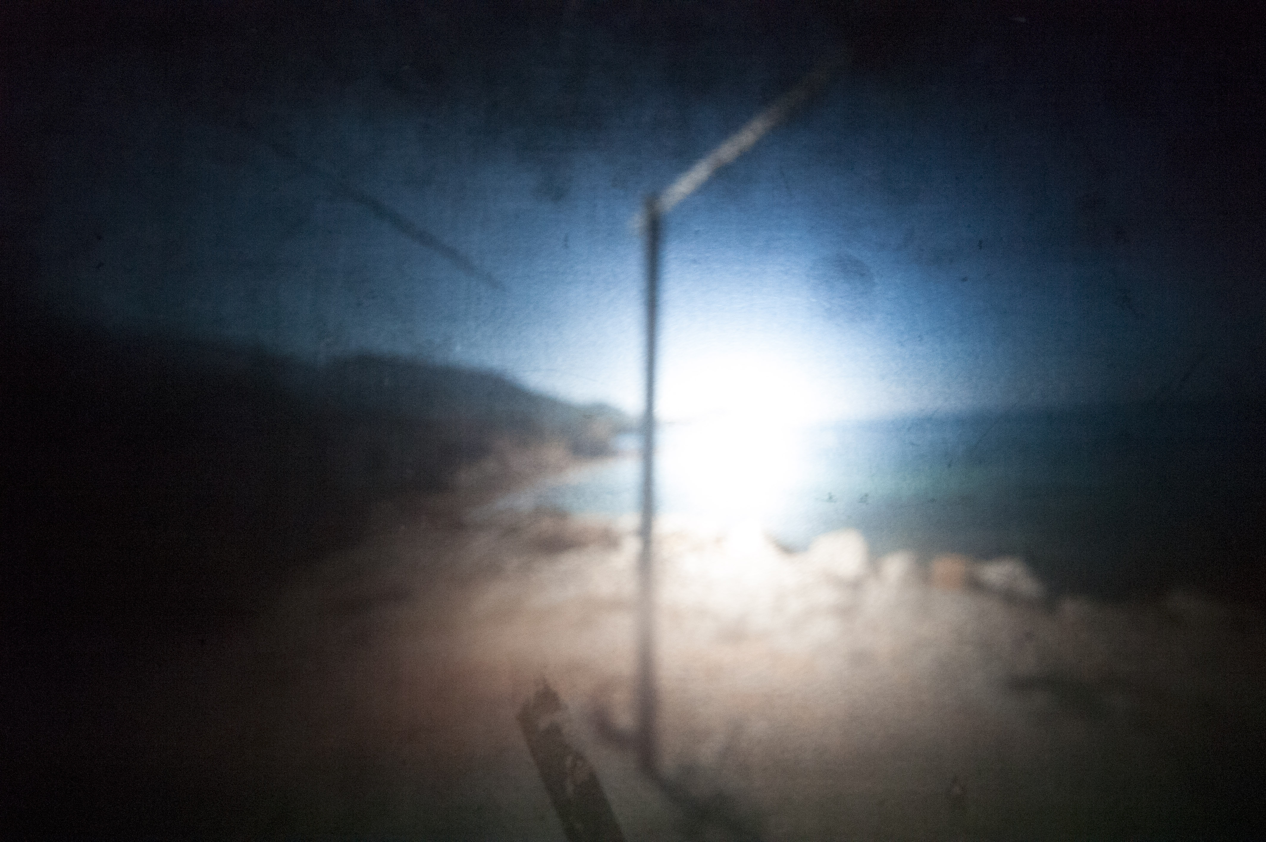 Après une série de repérages avec le film instantané Fuji Instax Wide et au téléphone portable, Yannick Vigouroux les abandonne un temps pour installer sa tente-sténopé sur la plage de l’Anse des Phocéens et poursuivre sa quête des Littoralités avec un autre dispositif. Une chambre noire, aux parois faites d’une bâche épaisse de plastique vert, et une ouverture minuscule pour scruter l’impression d’horizons proches et lointains sur une plaque de plexiglas, en saisir l’empreinte lumineuse sur un capteur numérique. Le dispositif, entre bricolage et hyper-technicité, devient métaphore et oxymore. Cabine de plage, cabanon ou poste de guet qui réactive inlassablement le mythe de Gyptis et de Protis, celle qui venait de la terre et celui qui venait de la mer. Trouée dans le noir profond du plein jour, la lumière éclabousse les bords de l’effet-tunnel, éblouit l’impact, fondant dans une même aube les surfaces du sol et de l’eau. Elle vibre sur le papier comme sur la peau. Ni lune, ni soleil, figés au zénith dans la densité de leur éclat, mais fulguration au centre du noir.
