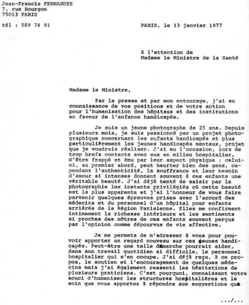 Je suis un jeune photographe de 25 ans. Depuis plusieurs mois, je suis passionné par un projet photographique concernant les enfants handicapés et plus particulièrement les jeunes handicapés mentaux, projet que je voudrais réaliser. J’ai eu l’occasion, lors de trop brefs contacts avec eux en milieu hospitalier, d’être frappé et ému par leur aspect physique : celui-ci, au premier abord, peut heurter bien des gens, cependant l’authenticité, la souffrance et leur besoin d’amour si intenses donnent souvent à ces enfants une véritable beauté. J’ai déjà tenté de saisir par la photographie les instants privilégiés où cette beauté est la plus apparente et j’ai l’honneur de vous faire parvenir quelques épreuves prises avec l’accord des médecins et du personnel d’un hôpital pour enfants arriérés de la Région Parisienne. Elles me confirment intimement la richesse intérieure et les sentiments si proches des nôtres de ces enfants souvent perçus par l’opinion comme dépourvus de vie affective.