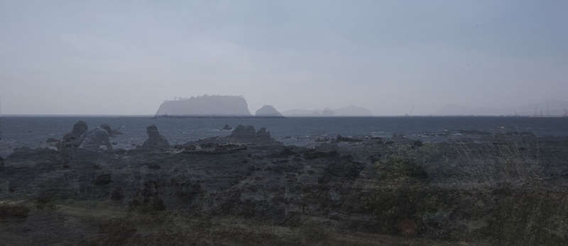 Ha Choon Keun s’empare donc d’une question, d’un sujet, par exemple l’île de Dokdo ou la DMZ, Hiroshima, mais aussi la découverte d’une ville à partir de points de vue sur les hauteurs de la montagne qui l’entoure, un trajet en bus ou en voiture, ou des bâtiments en ruine dans une zone non identifiée. Chaque sujet peut donc être considéré comme ayant une forte densité signifiante, politiquement ou historiquement, ou alors comme ayant apparemment une signification moins importante. Dans ce cas le sujet qui est lié à la vie quotidienne renvoie à un autre type de question, peut-être moins politique.