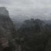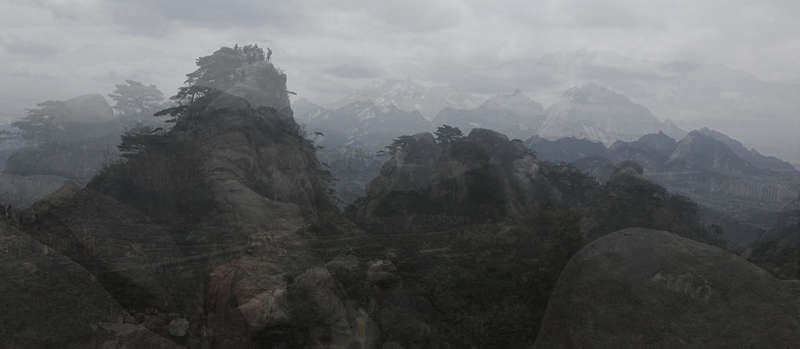 Il y a une obsession du cadrage et donc du cadre dans ces photographies. Comme le montrent les esquisses ou dessins préparatoires, l’image finale est le résultat d’un calcul savant et d’une préparation minutieuse. Le centre de l’image est le plus important, car c’est à partir de lui que l’équilibre de l’image finale va se former. Rails, poutrelle de pont, sommet de montagne ou de temple, le centre est l’axe qui structure chaque image. Souvent des éléments comme des espaces entre des rochers ou des portes viennent renforcer le cadrage et conférer une assise forte à l’image globale. Et cela est absolument nécessaire pour permettre à ces images dont l’apparence finale est troublée, brouillée et floue à cause des superpositions, de trouver une stabilité qui les rend vivantes en leur conférant une certaine forme d’élégance.