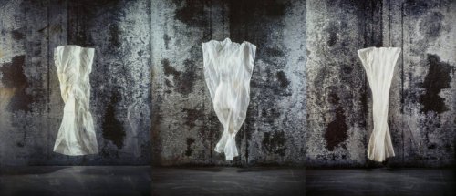 Réellement intrigué par ces plaques et ces disques en suspension dans le vide tacheté je fis part à Béatrice Helg de ma méditation sur le rapport qu’entretenaient ses œuvres avec certains développements particulièrement audacieux de la théorie des cordes. Elle m’avoua qu’elle n’avait jamais entendu parler de cette théorie mais elle m’indiqua qu’un astrophysicien fameux, Jean-Pierre Luminet, spécialiste des trous noirs mais il y en a plein, remarquable vulgarisateur et là il y en a moins, avait déjà rapproché l’une de ses séries, « Esprit froissés », de quelques réflexions qu’il entretenait à l’époque sur la géométrie de l’Univers et qu’il intitulait « L’univers chiffonné ». Personnellement, je trouvais que Luminet ça s’accordait bien à son obsession de la lumière à elle. « Esprits froissés » ce sont comme des mouchoirs, ou des chiffons, tout blancs, qu’on aurait laissé tomber par mégarde d’un balcon et qui virevolteraient dans l’air, ou alors les âmes des bienheureux de Hieronymus Bosch qui n’arriveraient pas à trouver l’entrée du grand trou blanc se heurtant sans cesse à la grisaille d’une muraille d’acier portées qu’elles seraient par les vents malicieux du Malin évidemment, ou bien encore l’univers chiffonné de Luminet vu sous différents angles et en suspension parce que lui n’est pas très partisan du multivers, à ce que je crois savoir. Toujours est-il, Helg avait placé trois spécimens de ses « Esprits froissés » au milieu des gigantesques grisailles vantant les vertus d’une autre République commises par Jacques Reattu et leurs murailles grisâtres fonctionnaient parfaitement avec celles-ci. Une république vertueuse donc obligatoirement autre ! Les formes blanches froissées sont comme des fragments de la statuaire grecque classique et de ses drapés, corps de la femme merveilleusement moulé, mais en esprit.