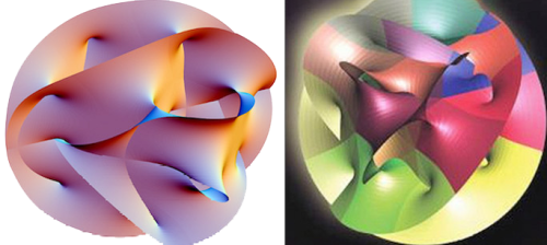 La théorie des cordes ! Celle-ci fabrique et consomme des mathématiques et elle invente, mathématiquement, tout un tas d’objets nouveaux à commencer par les minuscules cordes, auxquelles elle doit son nom, qui se substituent aux corpuscules de la physique classique en tant que particules élémentaires. Les cordes sont des sortes de petits élastiques incassables et pleins d’énergie qui vibrent dans les nombreux trous et tunnels de structures géométriques complexes, les « Calabi-Yau », espaces infimes constitués par des dimensions supplémentaires enroulées sur elles-mêmes et toute emmêlées, dimensions supplémentaires dont la théorie avait besoin pour « se purger de certains détails problématiques » qui affleuraient dans les calculs expliquent les « cordistes ». En effet, les mathématiques de la théorie des cordes, et de son prolongement la théorie M, ont révélé un univers doté d’un espace-temps à dix dimensions d’espace et une de temps, donc avec sept dimensions d’espace supplémentaires, et elles ont fait émerger des objets singuliers appelés « branes ». Les dimensions supplémentaires ne sont pas une coquetterie de mathématiciens car le mode vibratoire des particules qui définit leurs propriétés, masse, spin, et charge électrique, dépend de la géométrie adoptée par ses dimensions. En passant des cordes aux branes on passe de l’infiniment petit à l’infiniment grand. Les branes peuvent avoir une à neuf dimensions, voire plus pour certains chercheurs. Une Une-brane est à la limite une corde mais plus sûrement une ligne. Comme les cordes, les Une-branes vibrent et ondulent constamment dans un univers en continuelle expansion, agitation qui génère des ondes gravitationnelles. C’est à partir des branes à trois dimensions, qu’on va revenir à Béatrice Helg car une Trois-brane peut envahir l’espace dans sa totalité. Une Trois-brane est potentiellement une brane-univers et comme l’espace de la théorie des cordes/théorie M est multidimensionnel, ce que je nomme l’hyperespace, il peut accueillir plusieurs Trois-branes, c’est-à-dire d’autres univers qui, selon certains physiciens, s’entrechoqueraient périodiquement et plongeraient lesdits univers dans un cycle perpétuel de naissance-mort-renaissance, mais ça c’est la théorie « ekpyrotique » qui le raconte. On parle de « scénarios des mondes de branes ». Mathématiquement on a créé plus de dix puissance cinq-cents formes d’espaces de Calabi-Yau, découlant les unes des autres en fait, en toute logique, un suivi de plus de cinq-cents zéros, soit pour les physiciens « cordistes » la possibilité de plus de dix puissance cinq-cents univers, autant dire l’Infini. Métaphysique !