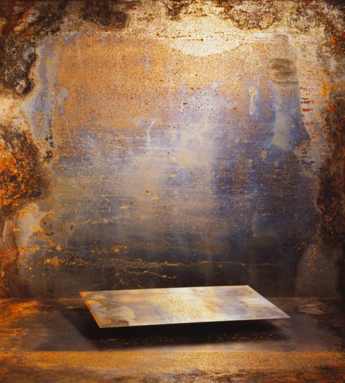 Pour en revenir à Béatrice Helg, avec ou sans l’aide de Dieu, elle se « contente » d’effectuer des prélèvements dans l’Hyperespace, de capturer les univers errants puis de les retenir dans des boîtes de ferraille sans couvercle et dont elle aurait découpé trois côtés afin de les offrir en représentation tels des comédiens campés sur les tréteaux d’un théâtre ô combien cosmique. Plus prosaïquement elle fouille avec méticulosité les décharges des chantiers de construction afin de récupérer les matériaux qu’elle juge intéressants, plaques de métal, vitrages et fer à béton, matières devenues quasi-organiques car ravagées par le Temps, les intempéries et l’inconséquence des hommes. Puis elle réalise à partir de ceux-ci des sculptures que certains qualifient de minimales, mais ils ont tort car le minimalisme n’existe pas, ou plutôt que des sculptures de véritables maquettes architecturales qu’elle soumet ensuite à l’arbitrage d’une lampe pilote, halogène ou autre, et qui lui permet de définir ses sources et ses angles d’éclairage. Enfin, par la coordination d’une batterie de flashs, elle prend des photographies, au départ uniquement à la chambre, travaille ensuite en cibachrome, pour la pureté de son expression bien sûr, et aujourd’hui essentiellement en numérique ce dernier lui ouvrant de nouvelles perspectives, lui apportant un nouveau regard ainsi qu’un réel confort car les images numériques sont des matrices de chiffres que l’on peut triturer à son goût, selon ses intentions. Une fois les photographies prises, les installations sont détruites ce qui interdit toute répétition et insuffle une dynamique dans la création. Chaque image est une nouvelle installation. Helg affirme qu’elle a toujours l’image en tête ainsi qu’un format avant de la créer. Elle déclare aussi qu’elle n’a pas de recette, pas de règles, pas de méthode, car tout ceci limite l’exploration. Voilà pour la technique, la méthode, quoiqu’elle puisse en dire il y en a bien une, mais c’est ici une description très sommaire du fait de mon insuffisance criante en ces matières car pour moi tout ceci relève purement de l’alchimie, voire de la magie !