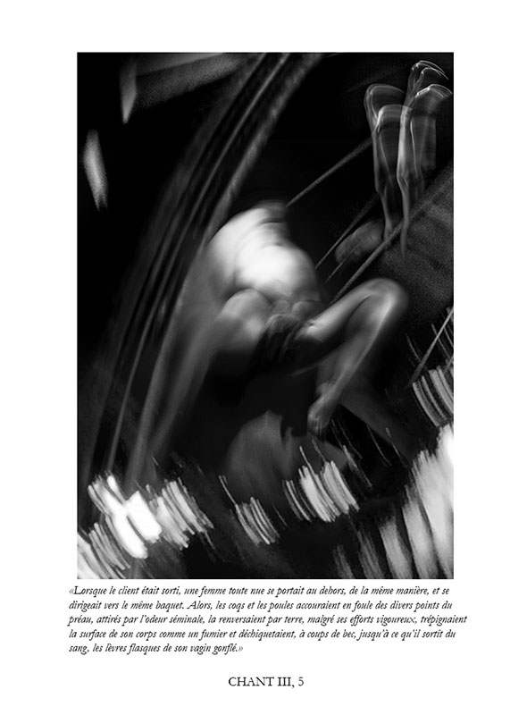 " Après avoir travaillé sur l’Enfer de Dante, un Enfer figé pour tous les pêcheurs en un éternel recommencement, j’avais envie de me confronter aux « Chants de Maldoror », un Enfer de tous les possibles, un Enfer vivant, notre monde.