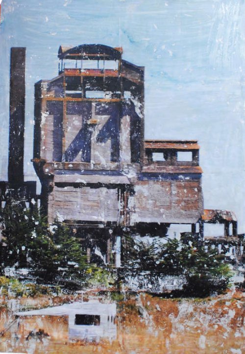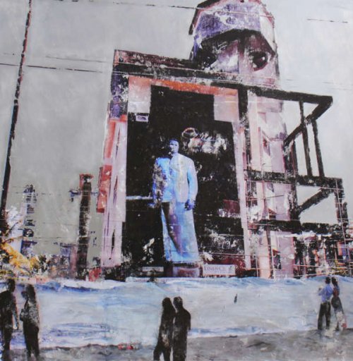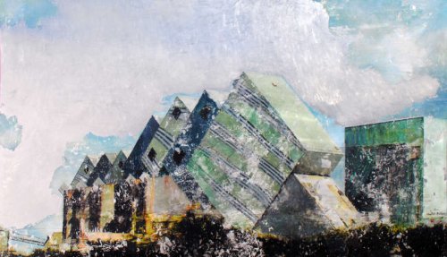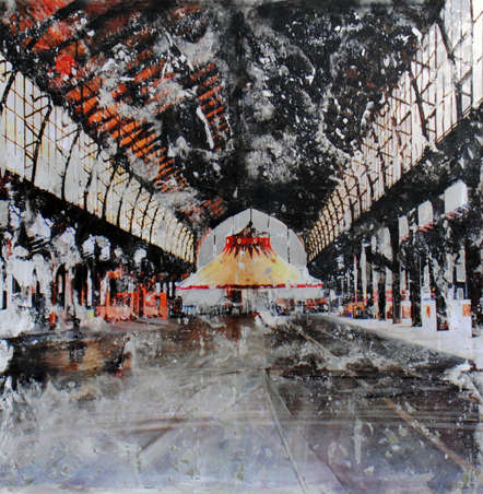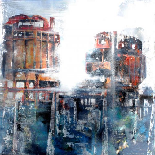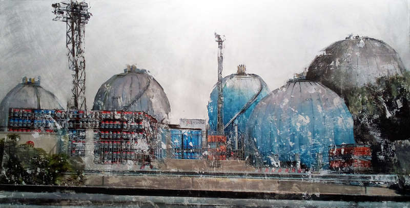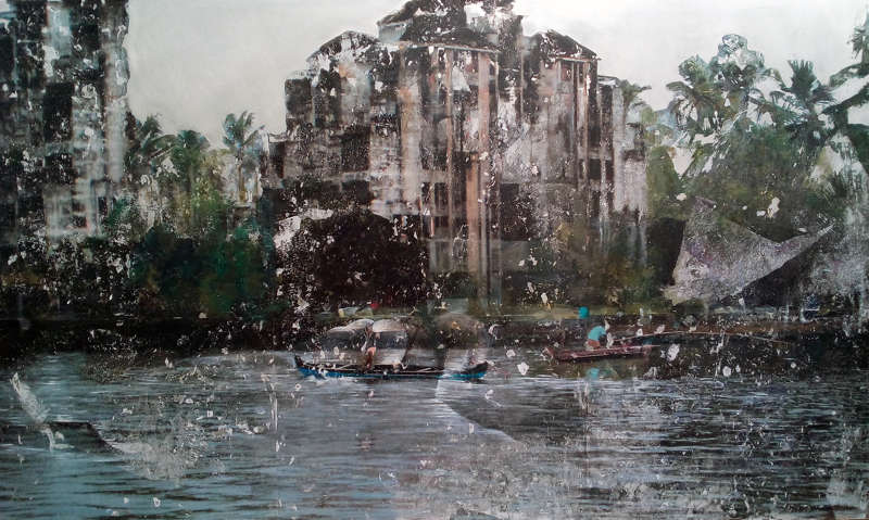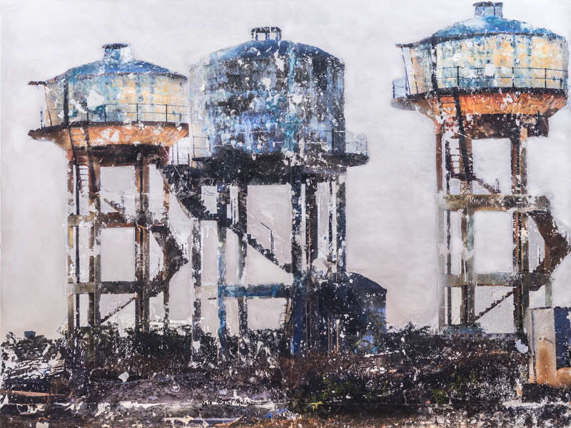 La transfiguration s’opère par l’hybridation du montage numérique, de la peinture et de la gravure le plus souvent sur des supports métalliques (aluminium ou acier inoxydable). Dans un premier temps, le montage numérique me permet d’assembler ou de modifier des images réalisées au cours de mes voyages qui m’offrent sans cesse l’occasion d’enrichir mon répertoire. Ensuite, la peinture avec ses couleurs, ses transparences ou ses épaisseurs prend le relai : je me réapproprie l’image transférée manuellement. En phase ultime, la gravure du métal produit la lumière selon un jeu de lignes choisies qui structurent mes espaces. En laissant ainsi passer par endroits la brillance de l’aluminium, l’image se modifie lorsqu’on se déplace devant l’œuvre, créant une interaction entre celle-ci et celui qui la regarde.