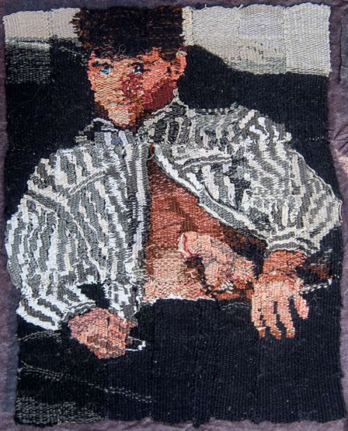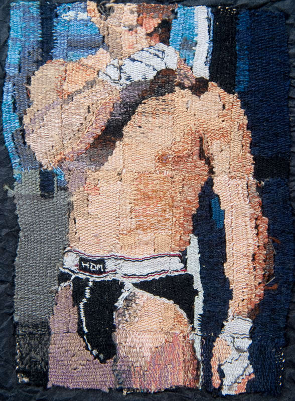 Trivialité, de celle qui, si l’on s’arrête un instant pour la regarder, fait la beauté du quotidien. Petits détails, choses insignifiantes, jeux de couleur et de lumière, ils se subliment dans le long travail du tissage. Trivialité aussi, frisant l’obscénité des ces corps masculins, body-buildés, de sportifs bien membrés, de bière ordinaire… Ils atteignent à une spiritualité goguenarde, reportés sur le fil, entremêlés comme à la mêlée, entrelardés de rose et orange.