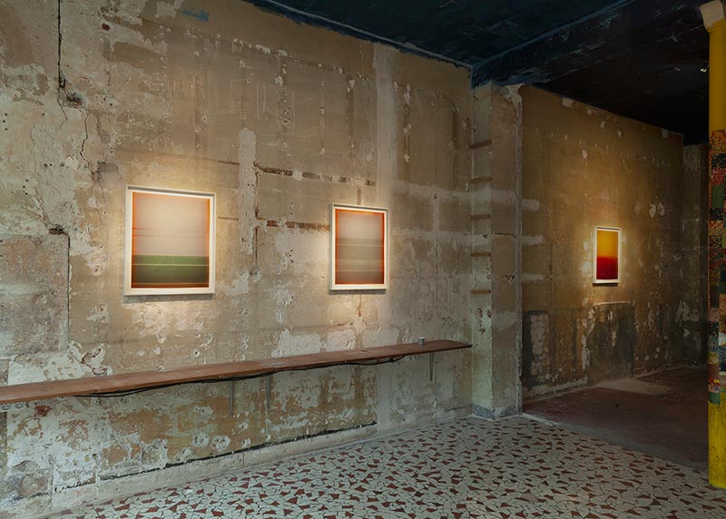 La série aujourd’hui présentée à la Galerie Javault, intitulée Météores, a été pensée pour l’espace de la galerie et marque pour l’artiste l’utilisation d’une technique nouvelle. Produite avec un papier ancien et rare à la brillance et au rendu des couleurs très particuliers, cette série est le fruit d’un jeu de surdéveloppement mécanique de certaines parties d’un même tirage et se veut un travail sur le temps et l’accumulation du temps dans le processus chimique d’apparition de l’image. La série est construite à partir d’un premier tirage monochromatique dont la teinte est obtenue par solarisation et dont l’artiste vient dans un second temps travailler les bords. Viennent ensuite les tirages successifs qui prennent pour fond ce premier monochrome - répété aussi fidèlement que possible, chaque tirage étant unique - et dans lesquels les formes, les strates, sont obtenues uniquement par le développement.
