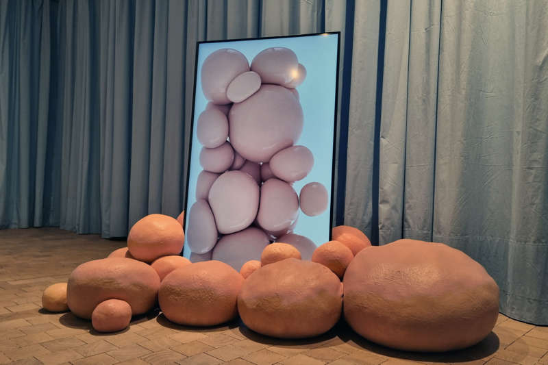 Lorsque Stine Deja et Marie Munk opèrent ensemble, leurs esthétiques dialoguent et s’entremêlent. Dans cette installation de la série Synthetic Seduction, les objets qui sont au sol semblent se poursuivre dans l’image de l’écran, à moins que ce ne soit l’inverse ! Aussi on s’interroge sur leurs similarités autant que sur leurs différences, entre sculpture et image, pour mieux en saisir la nature. Leur rondeur nous les dit organiques quand leur couleur chair évoque la peau. Statiques sur le sol, elles ont une matérialité quelque peu différente dans l’espace de l’image, là où le cadre les contraint dans leurs mouvements. Les sculptures de différentes tailles qui reposent au sol, si elles étaient sorties du cadre de l’écran pour envahir l’espace tangible de l’exposition, auraient au passage perdu de leur virtuelle brillance pour renforcer quelque peu leur présence. Comme si tout se passait dans l’interstice qui sépare les objets de leur représentation, quand bien même elle soit en trois dimensions et sans que l’on sache dans quel sens elle pourrait se déplacer.