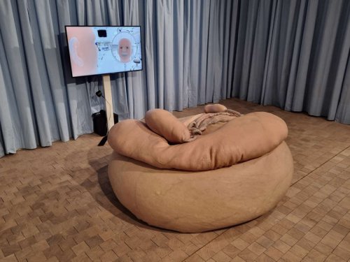 C’est dans un environnement de type hospitalier délimité par un rideau bleu que Stine Deja et Marie Munk nous invitent à prendre place sur une sculpture à la texture cutanée. D’allure organique, elle réagit au toucher comme pour simuler le vivant. C’est donc peau contre peau (Skin-to-Skin) — artificielle ou réelle — que l’on observe confortablement la séquence en trois dimensions Foreigner convoquant quant à elle l’intelligence artificielle. Car l’être qui semble découvrir son propre visage dans une salle d’éveil apparaît doté d’une conscience sans expérience aucune. C’est en tout cas ce que laisse penser la chanson des années 80 au refrain « Je voudrais savoir ce qu’est l’amour » qu’il entonne dans un tel contexte. La question des émotions des êtres artificiels est récurrente dans les scénarios de science-fiction du siècle dernier. Quand elle s’avère essentielle dans les laboratoires de recherche où émergent des agents conversationnels en quête de corps sans vécu. En attribuant des formes à leurs idées, ces deux artistes questionnent le post-humain sachant que les fictions, souvent, précèdent les sciences.