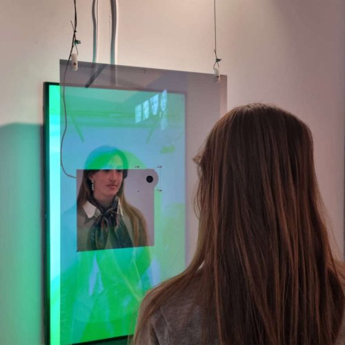 L’installation No us (but 1 of) de Mogens Jacobsen est constituée d’appareils dédiés à l’entrée, au traitement et à la sortie. Il y a tout d’abord une sorte de miroir-écran permettant au public d’entrer littéralement dans l’œuvre s’articulant autour d’une intelligence artificielle. Cette dernière “invente” des visages en s’inspirant de ceux des spectatrices et spectateurs de l’œuvre qui se génère sous leurs yeux. L’artiste, en quelque sorte, fait de l’espace d’exposition son atelier durant que la machine crée des portraits dont on ignore le coefficient de réalité. Ce qui renforce l’idée que l’on se construit au contact d’autrui en cette ère où l’autre, de plus en plus, est technologique. Notons enfin le choix de l’artiste de diffuser l’intégralité de ses innombrables portraits au travers d’une technique audiovisuelle qui renvoie aux origines de la télévision. Est-ce une façon de nous dire qu’en termes d’intelligence artificielle tout reste à faire ? Quand celle-ci, ces derniers temps, est devenue l’une d’entre nous !