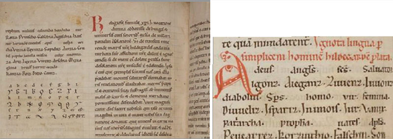 Hildegarde va inventer une langue mais est-ce une langue pour les initiés, ses consœurs de couvent ? une langue sacrée pour parler intimement à son dieu ? une langue inconnue de l’Antéchrist comme cela a pu être avancé ? Une forme de glossolalie ce qui renverrait davantage à la clinique qu’au strict christianisme ? Tout a été dit mais, tout bien considéré, la « lingua ignota » n’est pas si inconnue que cela. C’est une sorte de pidgin s’appuyant sur une base latino-germanique, mais davantage latine que germanique, composée essentiellement d’adjectifs substantivés ou simplement d’adjectifs. Aucune syntaxe ! Elle est d’usage sacré mais aussi musicale et donc par nature céleste. Hildegarde a pris la précaution de traduire en latin chacun des mots de ce nouveau lexique, ce qui facilite grandement les choses pour saisir les sujets que ces mots, à peu près un millier, sont censés porter et soutenir, l’ordre divin, les devoirs humains, l’Église, le naturalisme, le Temps etc. Ce qui est surprenant c’est que, parallèlement, Hildegarde ait créé un alphabet de vingt-trois lettres, les « litterae ignotae », qu’elle n’a jamais utilisées pour la « lingua ignota », ou pour quoi que ce soit d’autre d’ailleurs.