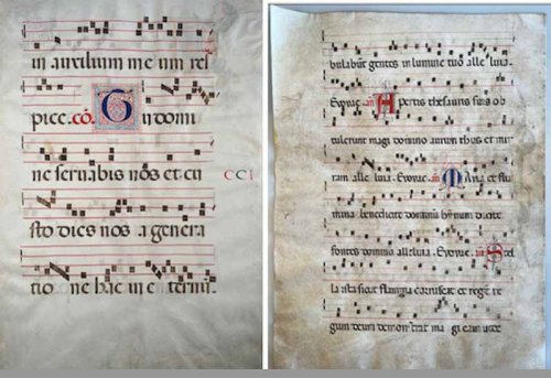 Et puis arrive Grégoire, pape de son état, qui cherche à remettre de l’ordre dans tout ça. Démarre un temps de codification, de normalisation et de réglementation tous azimuts, le calendrier, les messes, les oraisons, et bien sûr les chants. Concernant les chants, surtout pas de recherche esthétique, ni de virtuosité, tout doit être au service de la liturgie la plus stricte, un chantre, c’est-à-dire un soliste, désigné parmi les diacres intervenant en répons aux formules sacramentelles de l’officiant. Au tout début, c’est du « Sprechgesang » bien avant la lettre, autrement dit le chant se distingue à peine de la parole. On parle de « chant romain ». Progressivement un et même deux chœurs se substituent au chantre qui interviennent en écho ou en alternance avec l’officiant. On va parler alors de cantus planus, de plain-chant, c’est-à-dire de chant simple avec des voix strictement à l’unisson, aucune ne l’emportant sur les autres, dans un mouvement absolument uniforme. Tout instrument, objet du paganisme par nature, ainsi que toute ébauche de lyrisme sont proscrits. Les chœurs sont constitués uniquement de voix d’hommes et pendant des siècles il n’y a pas d’écriture musicale. La transmission des chants est mnémonique, c’est-à-dire qu’elle est orale et qu’il est donc fait appel à la mémoire. Enfin, probablement au milieu du siècle onze mais c’est discuté, apparaitront les neumes, première forme de transcription musicale. Les neumes sont des suites de points et de traits, qui deviendront des carrés et qui se compliqueront beaucoup par la suite, figurant sur une portée de quatre lignes. Ils peuvent être de trois ou quatre notes, voire plus au fil du temps.
