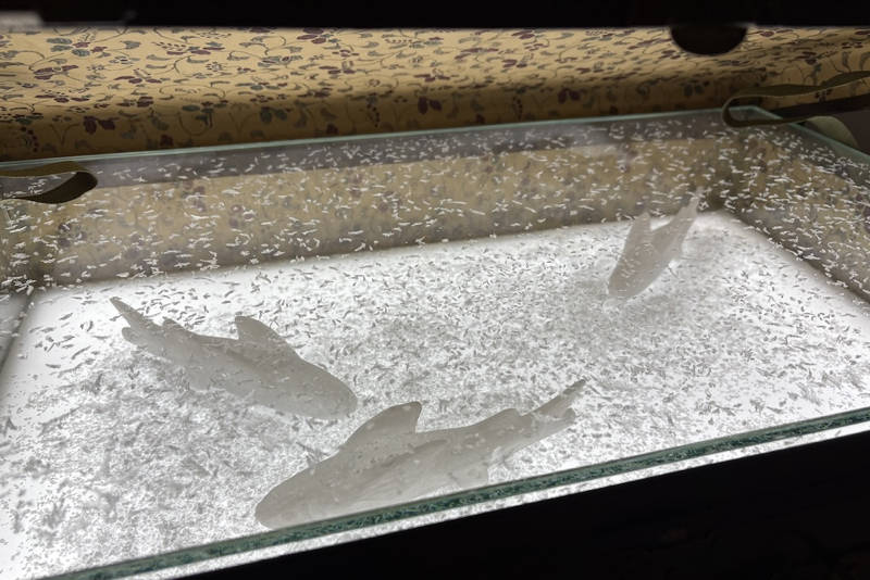 Là, le tigre endormi sans queue fascine tel un mirage, tandis qu’un trio de carpes se laisse apprivoiser dans une valise entrouverte.