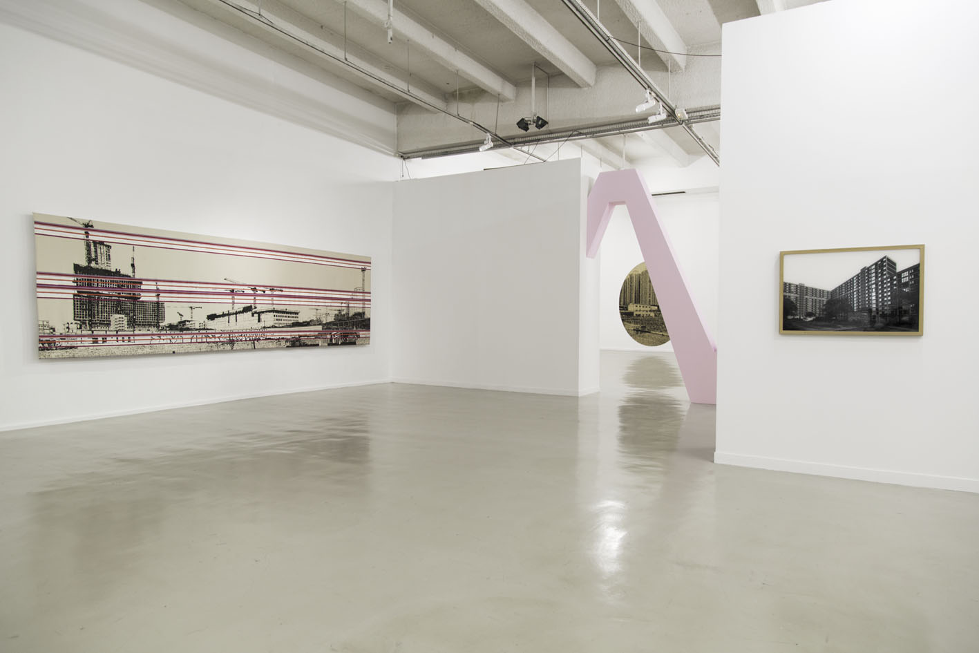 Une grande bannière sur toile à matelas étendue en avant du mur déploie le panorama d’un chantier parisien. En premier plan, un mur de graffitis, une voie ferrée, au loin des grues et bâtiments en construction. On reconnaît le palais de justice de Renzo Piano à main gauche. L’économie esthétique de la toile à matelas, bande rouge sur tissus écrus, est rehaussée par l’ajout de couleur blanche. Un tissage visuel se construit entre les bandes horizontales et le panoramique. Les façades surgissent dans le no man’s land d’un traitement ignorant des sols, oublieux de la rue, de l’avenue, d’une perspective Nevski autrefois capable de susciter la friction humaine.