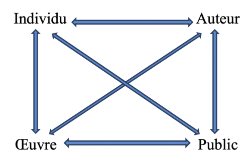 Finalement, nous avons affaire à une quadrilogie individu-auteur·rice-œuvre-public. Son premier mérite est de s’organiser autour d’enchaînements et non autour de points d’appui, de liens d’accords et de désaccords, de réussites et de revers, etc. Son second mérite est de laisser sa latitude nécessaire à « individu » de concerner les hommes et les femmes dans leur singularité ainsi que le processus de leur formation (familial, éducatif) en direction ou non d’un appel à devenir auteur ; à « auteur/autrice » de viser un type d’activité en premier lieu indéfini, vide, la visée-œuvre, ou une vie artistique pour laquelle la confrontation à des milieux, des règles, des objectifs est centrale, tout en se détachant de « individu » sans l’ignorer ; à « œuvre » de cerner des types de langage réélaborant la langue ordinaire, des conflits entre réalisations, des jeux de normes et de contestation de celles-ci en ouverture sur une adresse indéterminée, donc vide, à toutes et tous ; et à « lecteur/spectateur », ou à « public » d’évoquer des formes d’(auto-)éducation, de réformes ou de mises en question de soi. En quoi le graphe dynamogrammatique ci-dessous peut se sillonner selon les énergies sur lesquelles réfléchir.
