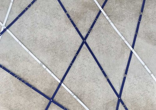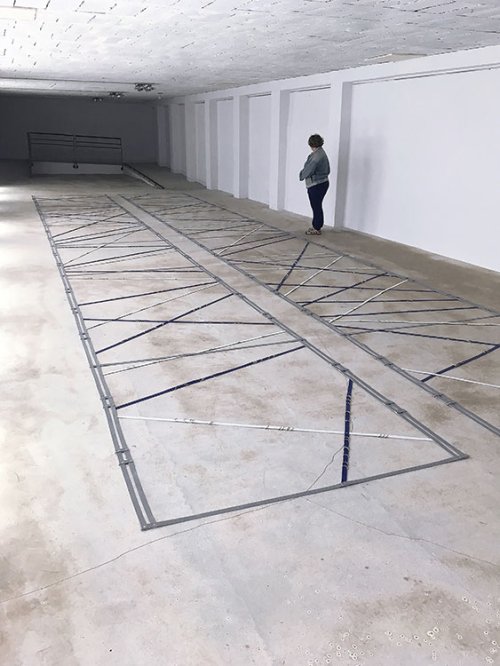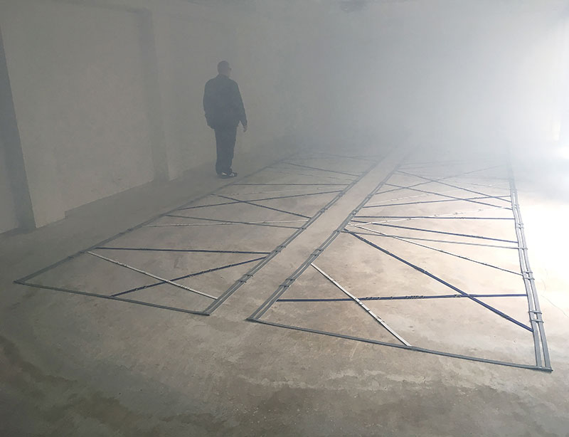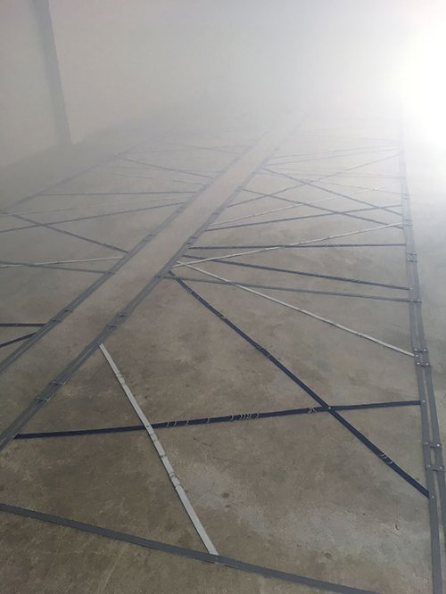Dans un second temps on trouve, au sol, deux rectangles de couleur bleu, blanc et gris de la taille d’une piste d’escrime, Scrima Ex Scrima. Floryan Varennes réinterprète les lignes et les trajectoires à partir du combat de référence qu’est l’escrime qui, pour lui, constitue la source de l’appareil formel et le principe d’engendrement des lignes qu’il déploie et qui, cette fois, se croisent au sol. Striant l’espace du tapis où se règlent les combats, les segments écartelés parlent la langue du duel. Le duel est la forme strictement codée d’une rencontre entre deux corps masqués, anonymes, lancés dans la bataille originelle, inoubliable parce qu’inscrite dans la mémoire de la chair qui veut la dépense, l’effort, le tremblement, la victoire ou la mort. Incidemment, l’air ambiant s’est empli d’une brume dans laquelle chacun se retrouve immergé. On se retrouve comme prisonnier dans la bataille d’une guerre passée, et l’on comprend que ce faux-semblant ne cesse de nous perdre.