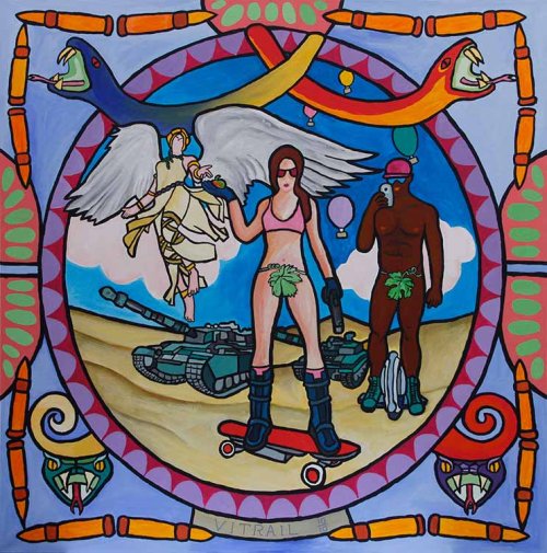 Proposer une exposition présentant des vitraux est une idée que les artistes ont longtemps différée. Il est avéré que dès leurs premiers travaux, les aplats de couleur vive qu’ils privilégient montrent un goût assumé pour une luminosité dont les prémisses sont à chercher aussi bien du côté des couleurs acidulées et cathodiques des téléviseurs que de la fréquentation des édifices où la figuration gothique expose en majesté ses verrières polychromes.
