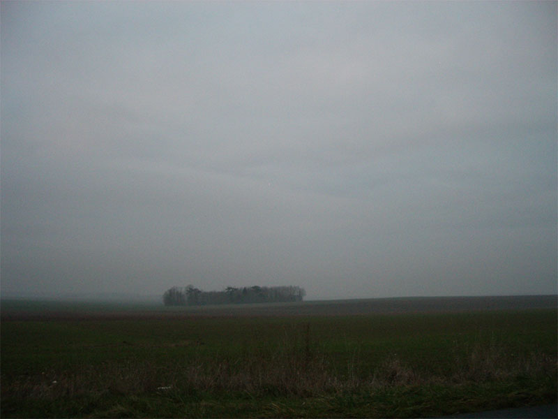 Comme le bruit d’une rumeur se répètent des sons scandés à la manière d’une comptine arrêtée dans son élan, la comptine entêtante renaissant d’un disque rayé sur la platine d’un phonographe quand derrière naît le mouvement du jour qui s’est levé et s’éclaircit encore... Comme des chats pleurent, grincent un peu ces sons de la rumeur parmi les brumes vagues qui se dissipent avec lenteur sous les arbres des haies où volettent des oiseaux vifs et pressés dans la pénombre de l’entrelacement des branches et des ramures de ronces. Et bleutées derrière flottant sur l’herbe verte des nappes de brouillard s’effilochent, se condensent, se rapprochent et s’étirent imperceptiblement quand jappe un chevreuil bruyamment provoquant l’envol d’un corbeau et de deux étourneaux dont chaque corps sous le ciel trace alors un point fuyant qui vient à passer dans les yeux, une tache sur le globe oculaire voguant, un petit signe de rien, léger et surnageant, à la surface en une danse qui s’éloigne, se retire, s’écoule, les oiseaux disparus, dans la largeur du ciel et l’infini des gris... Une voix crie « oui-ya » ce qui ne veut rien dire mais se trouve-oui, ensoleillée comme un acquiescement tandis que j’approche de la fenêtre et fouille une touffe d’herbes épaisses derrière laquelle des mouvements se découvrent, « des mouvements de quoi ? » C’est ce qui occupe alors le temps pendant que le silence autour, dans ce milieu, s’installe lentement, lentement..., lentement, mentalement coule comme le bâillement vient éclore dans le sans-bruit, comme un froissage éteint, inaudible et tendu, dans le profond du pelage de neige d’une sorte de chat dormant...