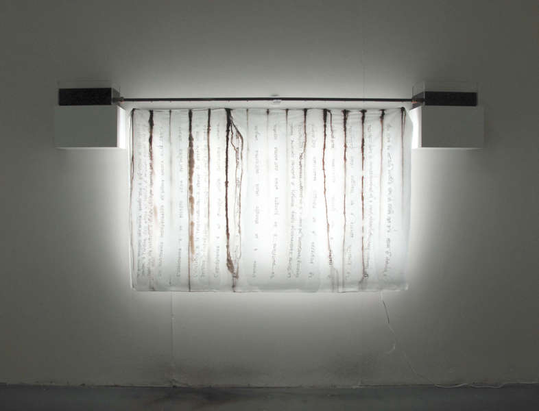 The phainómenon of transmutation marks most of the artistic production of Francesca Capasso. It animates Proclama, another homage to the partisans, and Mappe, a project designed for the abbey of Bucine, Arezzo. Irrigazioni is a white cloth on which are embroidered the needs of the soul, as described by Simon Weil in the essay The need for roots. Through a plexiglass irrigation system, the pure white linen is (de)signed by the random strokes of the water and black pigments that follow - and escape - the outline, disclosing an unexpected yet moving cartography of the soul. In those words, embroidered but snagged, a shallow and lazy look would have seen nothing but a scribble.