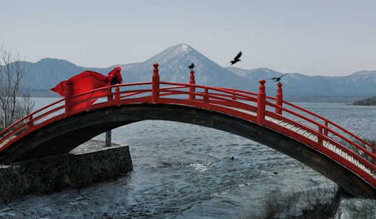 C’est la rencontre entre deux cultures, de l’Est et de l’Ouest, entre verticalité et horizontalité. C’est un entrejeu des interventions prévues et des situations et des objets retrouvés, qui se dessine comme un fil rouge entres les images.