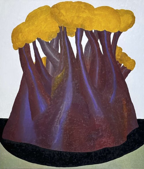 Ces peintures imaginatives se construisent dans l’alchimie de la sensation intérieure et du geste pictural. Le peintre accompagne le mouvement intérieur du vivant. Accrochés sur un sol de peinture, les troncs, branches, houppiers, pistils s’élèvent en abstractions. Ils sont à la fois, coupé de toute forme de réalisme et profondément accordés aux résonances vibratoires du vivant. Arbre, fleur, pistil et étamines semblent surgir d’un monde végétal primitif, d’un monde d’avant l’apparition des premiers primates. Entre l’intemporalité de la sensation et l’écoute d’une nature première, le peintre nous rappelle à l’autopoïèse et à la symbiose permanente des organismes vivants. Il n’est pas fortuit de rappeler ici, que 95 % des plantes terrestres aient aujourd’hui des champignons symbiotiques dans leurs racines, appelés mycorhizes et que 15 000 à 30 000 bactéries différentes vivent dans le corps humain.