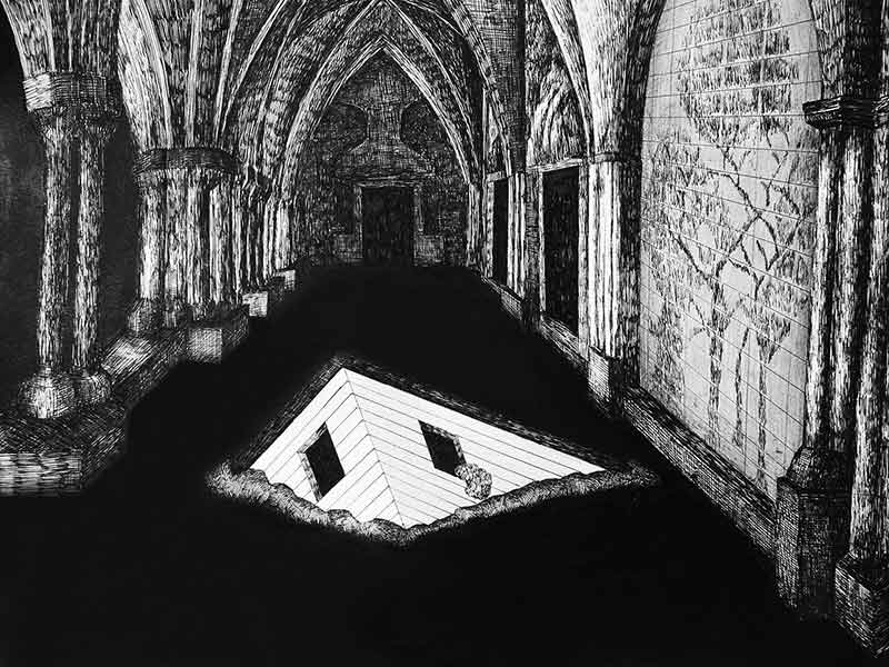 Christian symbolism and the church architecture emerge in Mária’s œuvre regularly, last time in the series Stations of Crisis. In the newer Brave World the artist directs our gaze into the interior of sacral architecture : to the naves, transepts and chapels of the cloisters and cathedrals from Middle Ages. These are without doubt the most monumental material and artistic manifestations of the Christian tradition in Europe. She brings various strange objects and phenomena to these spaces and therefore disturbs the genre impression of the drawings. Indeed, these depictions of church interiors denote more metaphysical than physical space, but deprived of its divine aura represented by the light coming through the colourful glass windows. In these mute skeletons are the fragments of the secular world trapped in the iconic black matter/fluid. The artist shifts the discussion to the framework of thinking about systems (religious, social, cultural), about their borders, confrontations and overlaps. According to legends, at the beginning of the world there was light. And at the beginning of the art/painting there was a line drawn alongside the shadow.