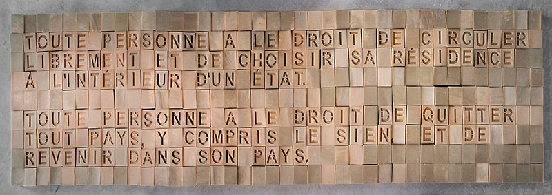 Illustration couverture : L’homme ne vit pas seulement de pain #2, 2012-2013 – Article 13 de la Déclaration universelle des droits de l’homme gravé à la main dans des savons de Marseille, 81 x 253,5 x 4 cm, Vue de l’exposition Ici, ailleurs, Friche la Belle de Mai, Marseille, 2013. Photo : Clementine Crochet
