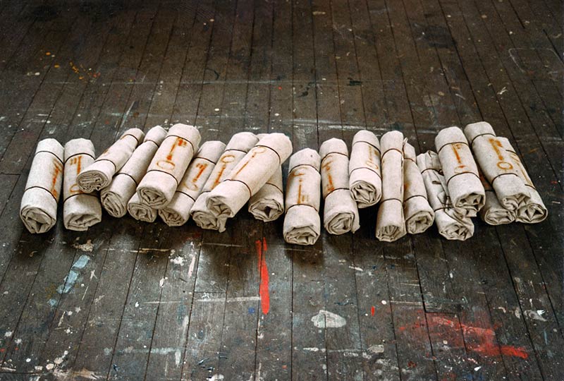 À la fin des années 1990, étudiant à l’École des Beaux Arts de Bourges, j’ai commencé à donner forme (plastiquement) à mon expérience de l’enfermement. En 1997, symbolisant la mémoire et le temps, la dépossession des terres, l’exode palestinien de 1948 et le droit au retour, l’espoir, j’ai transposé les empreintes de clefs de maison rouillées, par oxydation, sur des toiles de peintres roulées : Sans titre. Cette œuvre marque ma rupture avec la pratique picturale académique et mon désir de m’inscrire dans une démarche plus conceptuelle.