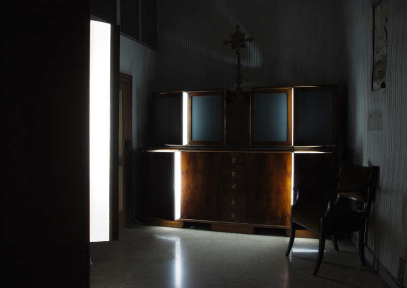 It consists of an installation projected and modified in situ, into the human and monumental space of the front door of an ancient building in the very center of the town, a place rich in signs of a glorious past but also full of contradictions of the present degradation, a wonderful den of heraldic symbols and drosses of unstable existences. In this place, quite safe from the gentrification, which almost compromised its features, Ciro Vitale operated by underlining the contradictions in order to strain its plural identity into individual and no longer common fragments : on one hand we can see the redemption of daily objects and symbols, now without its ordinary meaning, on the other, we can listen to the implacable voice of Mrs. Rita, the woman (who served as an accomplice to the installation) who lives and suffer in this front door.