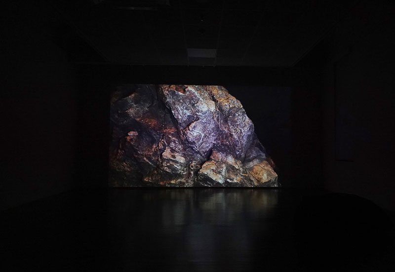 After reading other wall texts about rocks and looking at other rocks and semi-abstract pictures that seemed to be related to the topic presented in the exhibition, there was another video projection in the last part of the exhibition. The video presented a series of rocks with the traditional Korean melodies and lyrics, telling stories about the rocks. The exhibition text explained that the traditional song tells the stories about more than 80 rocks on its journey from Seoul to Pyongyang. The artist tried to trace the rocks described in the song without not-so-specific GPS information. For Oh, it was a journey and discoveries of the unknown in darkness. The artist wanted the audience to have a similar experience in the exhibition. The artist staged a dreamy space with the whole experience for the audience, who were not passive onlookers but active explorers. The audience moved around, looked at, listened to, read, felt, and found the hidden Korean traditions as if they hiked in darkness.