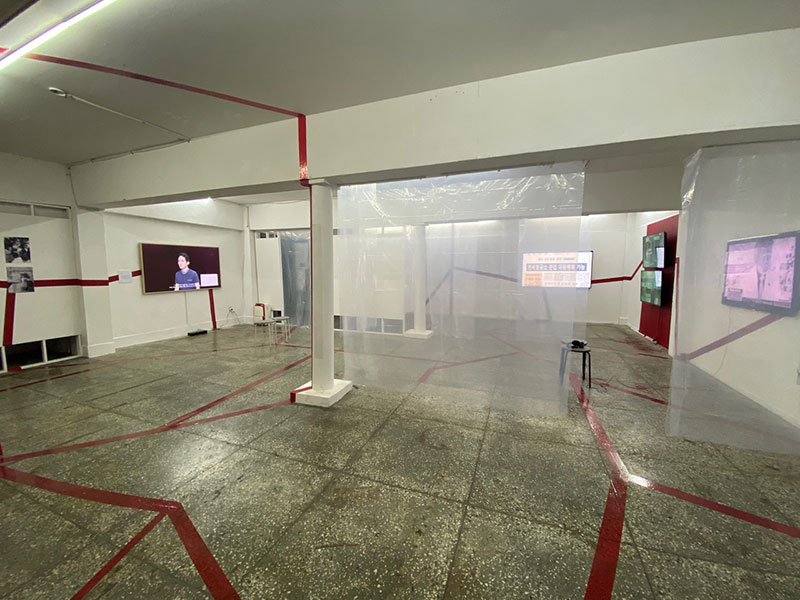 First, the exhibition space called Space XX is located in Mullae-dong, Seoul. It is an area where many steel manufacturers are located, with an increasing number of cafes, restaurants, and art spaces. In the exhibition, two artists’ works show the status of Mullae-dong that went through gentrification, and the remaining trace of the military regime that fostered the steel industry in the neighborhood.