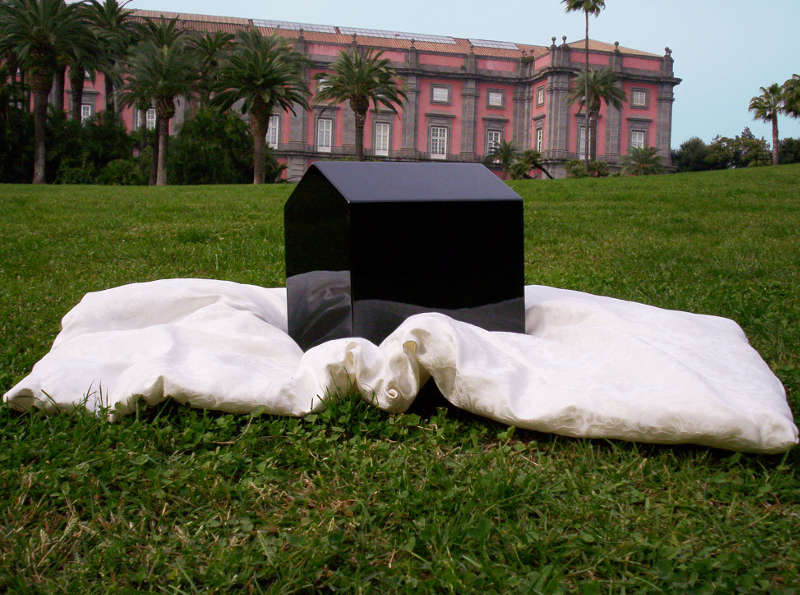 The "imprinting" of the urban outskirts returns in artworks like Le Case del Popolo (The houses of People, 2004), an installation in which sculptural elements in the form of a house, as a result of an essential geometry, are embellished with bright lacquers and unique pedestals on which they lay (such as the richly embroidered pillow in the background of the Royal Palace of Capodimonte).