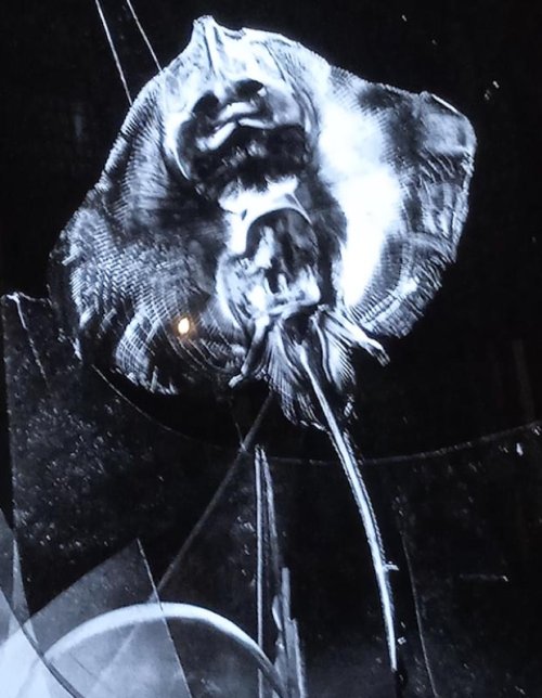 Il y aussi cette obsession des chimères, ces êtres composites angoissants tellement ils sont bizarres, souvent squelettes de chimère chez Medinger, arêtes de poisson avec crânes d’oiseau, femmes dépourvues de bras mais avec ailes de phalènes, monstres hybrides et débridés comme tout droit sortis de l’imagination de Jérôme Bosch, poires-oiseaux aux ailes en arêtes de poisson, picorant de leur bec de fer tout ce qui s’égarerait dans leur environnement d’acier, navets de forme oblongue comme jambes croisées d’une femme sans torse étendue sur une feuille de chou avec au-dessus d’elle deux globes oculaires franchement voyeurs — ce qui ne manque pas de renvoyer à « Étant donnés » de Duchamp ou à « Suzanne et les vieillards », et nombre d’autres créatures de cauchemar encore.