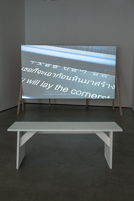 In the main room, Kwon presents a single-channel video and a sculptural installation titled Tying (2014-2016). This 28-minute video conveys emotional and psychological aspects of human desire and struggles in the industrial capitalism of Asia in the 20th and 21st centuries. It primarily shows the repetitive movements of factory machines of the textile industry in Asia with an audio of the interview of the artist’s own mother who was a former textile factory worker for over thirty years and another factory worker from Jim Thompson, a textile mill in Thailand. They both recall their experience in the factory in a somewhat nostalgic manner and worry about the current situation of the automatized factory where machines replace human laborers.