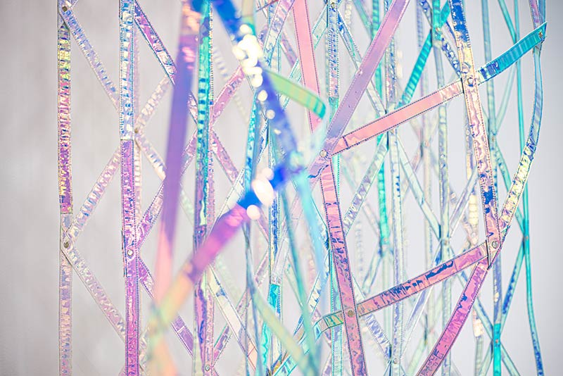 Renvoyant aux sens ou aux émotions, l’hypersensibilité fait référence à des états extrêmes du corps — qu’ils soient positifs ou négatifs —, une intensité retrouvée dans les œuvres de Floryan Varennes, faites de contrastes entre des matières, des formes et des concepts. Pour l’artiste qui a choisi de nommer Hypersensibilité sa première exposition personnelle à la Maëlle Galerie, cet état est surtout et avant tout une ouverture vers les autres, permise par une réceptivité exacerbée et mise au service de la compassion et de l’entraide. C’est ainsi que la Matriarche nous accueille dans l’exposition, entité futuriste en suspension dans l’espace, dont l’air menaçant n’a d’égal que son rôle tutélaire : assemblage de PVC et d’instruments médicaux, elle évoque aussi les formes d’une armure médiévale rivetée. Déesse du care, la Matriarche est à la fois curative et protectrice : elle veille sur nous.